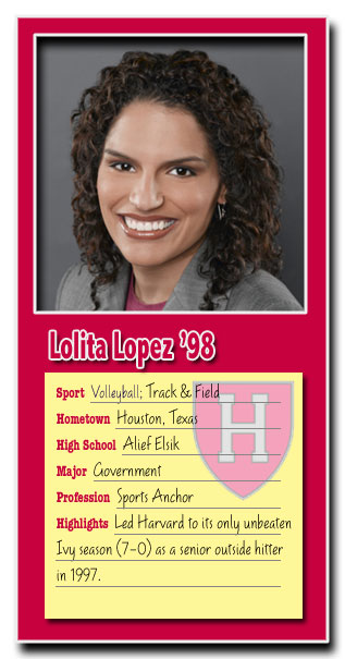 As a senior in high school Lopez's college choices came down to Harvard, Yale and Rice, but the recruiting trip to Cambridge convinced her that Harvard was the right place for her. Although her life-long ambition was to become a broadcast journalist -- one of the few majors Harvard does not offer -- she still felt the school provided the best combination of what she sought: outstanding academics and the opportunity to compete in Division I volleyball and track.