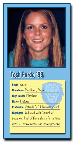 Ed. note - Columbia?s women?s soccer prospects were also assisted greatly by Tosh Forde?s teammate, Liz Cheung ?98. Playing defense, Cheung was three-time All-Ivy, including first team All-Ivy in 1997, and was named by Columbia to the Ivy League?s Silver Anniversary Team in 1999.