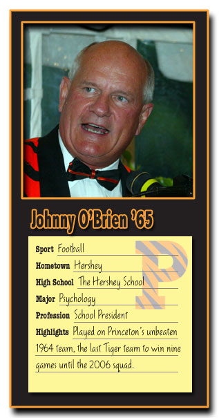 That self-discipline paid off. By O'Brien's junior year Iacavazzi -- a future College Football Hall of Famer -- led Princeton to a share of the Ivy title, and by senior year to a perfect 7-0 Ivy record, winning All-America honors for himself. For O'Brien, however -- whose greatest football memory is "helping my '64 team be Princeton's last undefeated team" -- football taught a different lesson.