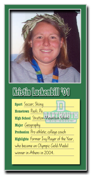 One can forgive Dartmouth's admissions office if they thought they were only getting a skier when they accepted Kristin Luckenbill, a graduate of the Stratton Mountain School, a renowned ski and snowboard academy. Instead they admitted, arguably, Dartmouth's greatest soccer player.