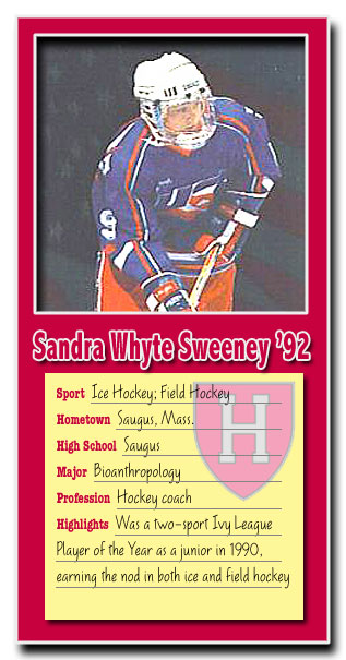 Former Harvard women's hockey coach John Dooley has glowing praise for Sandra Whyte Sweeney's gifts as an athlete. He remembers her as one of the most outstanding players he ever watched and cites her ability to accelerate with the puck as the best of all the athletes -- women and men -- that he has coached. Yet his comments quickly turn to Whyte Sweeney's personality and the quality of her leadership as a teammate.