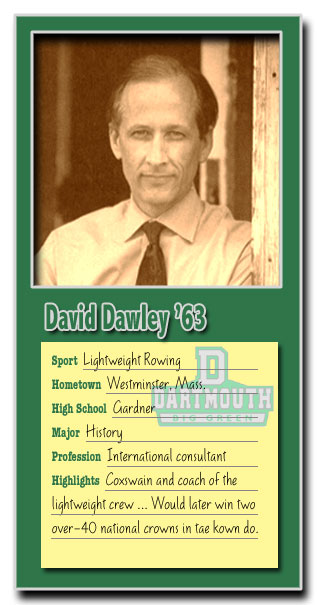 He was born in Westminster, Mass., to a Mayflower father and a Scottish-born mother, and attended a grade school of all-white students. There were two black students in his graduating class at Dartmouth; one on the crew team where he served as a coxswain and later as coach of the lightweight team; none in the outing club where he served as a ski instructor (Dawley would later be honored as one of the Wearers of the Green, Dartmouth's Athletic Hall of Fame, after winning two over-40 lightweight national crowns in tae kwon do).