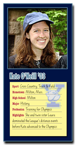 Of her many Yale running memories Kate O'Neill's favorites are of the 2000 cross country team. The pevious year they finished seventh at the Heptagonals, beating only two teams. The next year "we easily won the Heps and went on to place seventh in the whole country." What made the difference? "The team was made up of the same girls. The difference was the way we approached the season mentally. We talked over the summer and came to an agreement we could be a much better team. It reminds me of how much of sports is mental, not physical."