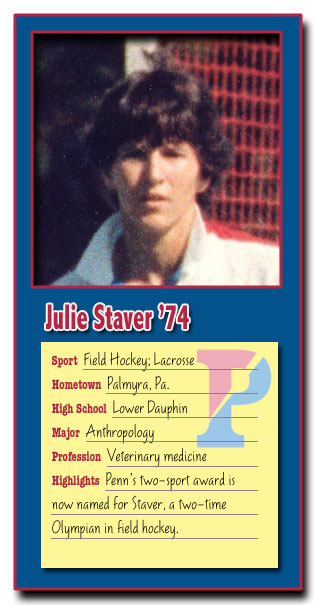 When Julie Staver started at Penn in 1970, she wouldn't have been eligible for the Julie Staver Award, given since 1982 to the best two-sport senior woman at Penn, because women's sports were not even accorded varsity status until well into her college career.